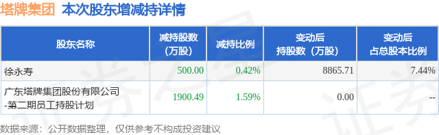 证券之星消息,12月2日塔牌集团发布公告《塔牌集团:关于持股5%以上股东减持股份触及1%刻度的公告》,其股东徐永寿、广东塔牌集团股份有限公司-第二期员工持股计划于2025年7月9日至2025年12月1日间合计减持2400.49万股,占公司目前总股本的2.0134%,变动期间该股股价上涨15.58%,截止12月1日收盘报9.05元。