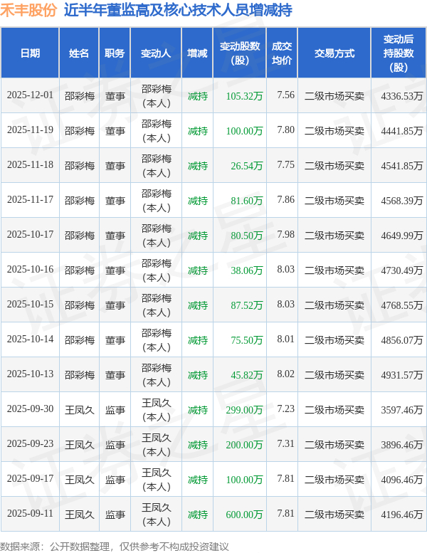 禾丰股份近半年内的董监高及核心技术人员增减持详情如下: