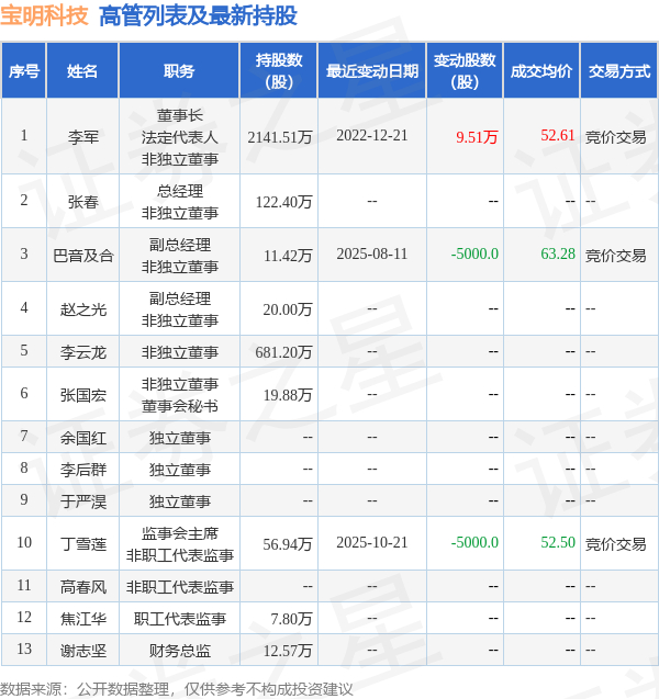 宝明科技的高管列表及最新持股情况如下: