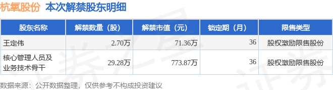 证券之星消息,根据市场公开信息整理,杭氧股份(002430)于12月3日将有31.98万股限售股份解禁,为公司股权激励限售股份,占公司总股本0.03%。(本次数据根据历史公告整理得出,实际情况以上市公司最新公告为准)最近一年内,该股累计解禁588.23万股,占总股本的0.6%。本次解禁后,公司还有35.83万股限售股份,占总股本0.04%。具体如下图所示:
