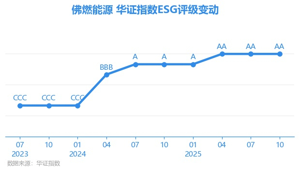 日前,华证指数公布了新一期(2025年10月31日)的ESG评级结果,佛燃能源(002911.SZ)获得AA评级(华证指数评级为C起至AAA九档,C为最低档,AAA为其最高一级评级/AA为其第二档),上一期(2025年7月31日)ESG评级为AA。本期ESG评级在22家燃气公用事业行业A股上市公司中排名第2(上一期排名第2)。