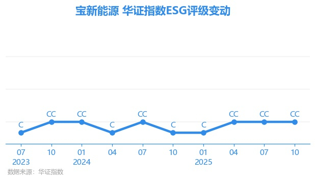 日前,华证指数公布了新一期(2025年10月31日)的ESG评级结果,宝新能源(000690.SZ)获得CC评级(华证指数评级为C起至AAA九档,C为最低档,AAA为其最高一级评级/AA为其第二档),上一期(2025年7月31日)ESG评级为CC。本期ESG评级在58家电力公用事业行业A股上市公司中排名第45(上一期排名第44)。