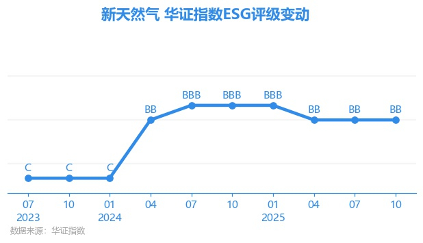 日前,华证指数公布了新一期(2025年10月31日)的ESG评级结果,新天然气(603393.SH)获得BB评级(华证指数评级为C起至AAA九档,C为最低档,AAA为其最高一级评级/AA为其第二档),上一期(2025年7月31日)ESG评级为BB。本期ESG评级在22家燃气公用事业行业A股上市公司中排名第4(上一期排名第4)。