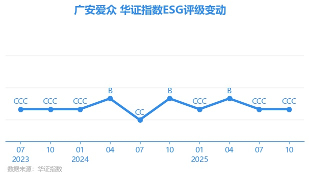 日前,华证指数公布了新一期(2025年10月31日)的ESG评级结果,广安爱众(600979.SH)获得CCC评级(华证指数评级为C起至AAA九档,C为最低档,AAA为其最高一级评级/AA为其第二档),上一期(2025年7月31日)ESG评级为CCC。本期ESG评级在12家复合型公用事业行业A股上市公司中排名第7(上一期排名第8)。