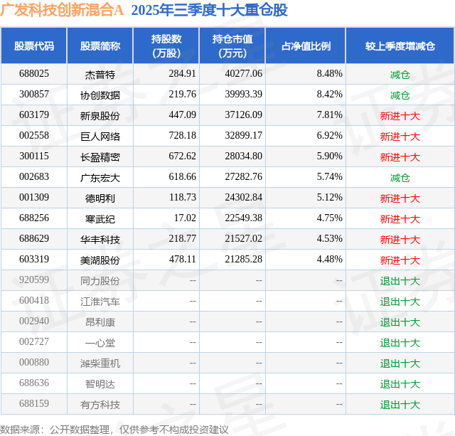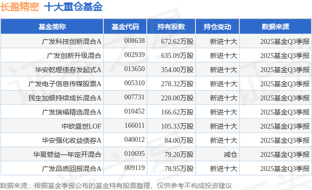 根据2025基金Q3季报公募基金重仓股数据,重仓该股的公募基金共55家,其中持有数量最多的公募基金为广发基金的广发科技创新混合A。广发科技创新混合A目前规模为31.41亿元,最新净值2.1577(12月2日),较上一交易日下跌0.86%,近一年上涨29.65%。该公募基金现任基金经理为吴远怡。吴远怡在任的基金产品包括:广发创新升级混合,管理时间为2020年9月30日至今,期间收益率为-21.58%;广发北交所精选两年定开混合A,管理时间为2021年11月23日至今,期间收益率为73.87%;广发价值核心混合A,管理时间为2022年11月1日至今,期间收益率为83.37%。