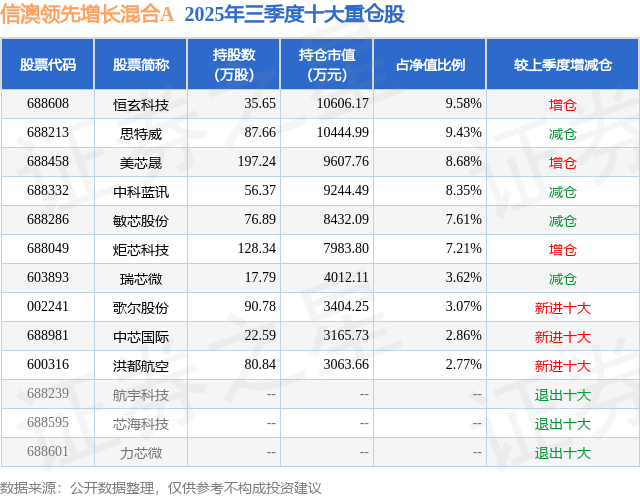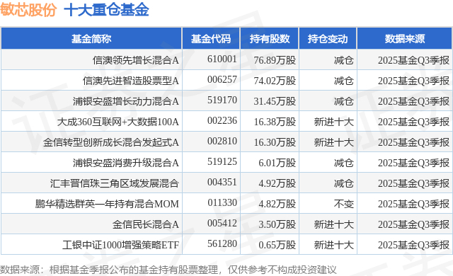 根据2025基金Q3季报公募基金重仓股数据,重仓该股的公募基金共11家,其中持有数量最多的公募基金为信达澳亚基金的信澳领先增长混合A。信澳领先增长混合A目前规模为9.95亿元,最新净值1.6653(12月2日),较上一交易日上涨0.03%,近一年上涨27.68%。该公募基金现任基金经理为齐兴方。齐兴方在任的基金产品包括:信澳先进智造股票型A,管理时间为2022年11月14日至今,期间收益率为13.29%;信澳至诚精选混合A,管理时间为2025年10月29日至今,期间收益率为-0.07%;信澳高端装备混合A,管理时间为2025年11月11日至今,期间收益率为0.0%。