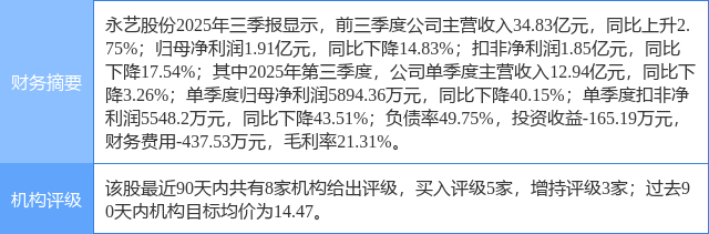 2025年10月28日,华安证券研究员徐偲,余倩莹发布了对永艺股份的研报《25Q3业绩短期承压,积极开拓新市场新客户》,该研报对永艺股份给出“买入”评级。研报中预计公司2025-2027年营收分别为51.56/57.39/62.3亿元,分别同比增长8.6%/11.3%/8.5%;归母净利润分别为3.21/3.84/4.46亿元,分别同比增长8.5%/19.5%/16.1%;EPS分别为0.97/1.16/1.35元,截至2025年10月27日,对应PE分别为11.81/9.88/8.51倍。维持“买入”评级。证券之星数据中心根据近三年发布的研报数据计算,该研报作者对此股的盈利预测准确度为91.02%。
