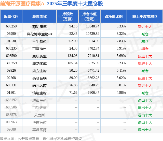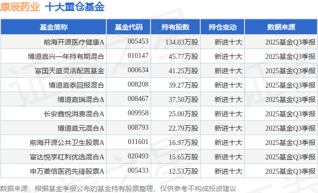 根据2025基金Q3季报公募基金重仓股数据,重仓该股的公募基金共17家,其中持有数量最多的公募基金为前海开源基金的前海开源医疗健康A。前海开源医疗健康A目前规模为5.46亿元,最新净值1.1826(12月2日),较上一交易日下跌2.11%,近一年上涨29.97%。该公募基金现任基金经理为范洁。范洁在任的基金产品包括:前海开源中药股票A,管理时间为2019年5月15日至今,期间收益率为72.65%;前海开源公共卫生股票A,管理时间为2021年3月25日至今,期间收益率为-55.52%。