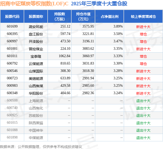 根据2025基金Q3季报公募基金重仓股数据,重仓该股的公募基金共1家,其中持有数量最多的公募基金为招商基金的招商中证煤炭等权指数(LOF)C。招商中证煤炭等权指数(LOF)C目前规模为2.42亿元,最新净值2.082(12月2日),较上一交易日上涨0.45%,近一年上涨7.94%。该公募基金现任基金经理为邓童 窦福成。邓童在任的基金产品包括:招商中证500指数增强A,管理时间为2021年11月23日至今,期间收益率为20.25%;招商大宗商品(LOF),管理时间为2021年12月2日至今,期间收益率为24.43%;招商北证50成份指数发起式A,管理时间为2022年12月22日至今,期间收益率为48.06%。窦福成在任的基金产品包括:招商中证全指红利质量ETF,管理时间为2025年11月13日至今,期间收益率为-1.74%;招商中证A100ETF,管理时间为2025年11月13日至今,期间收益率为-1.01%;招商中证物联网主题ETF,管理时间为2025年11月13日至今,期间收益率为2.71%。