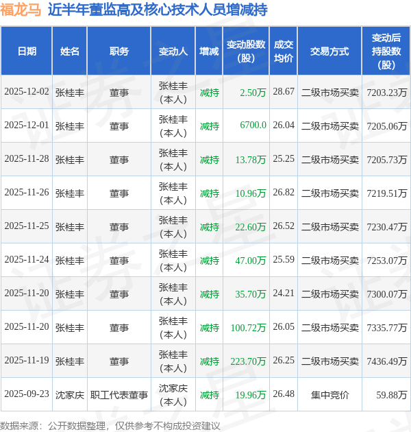福龙马近半年内的董监高及核心技术人员增减持详情如下: