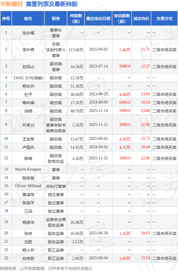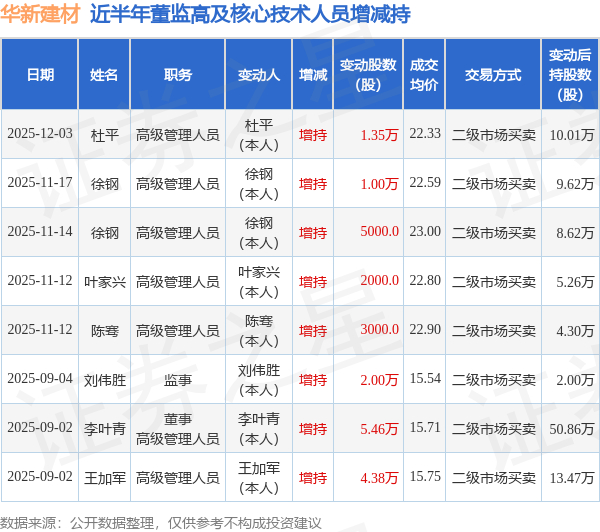 华新建材近半年内的董监高及核心技术人员增减持详情如下: