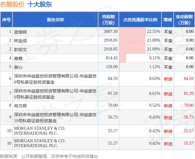 根据名雕股份2025年三季报公布的十大股东详情如下: