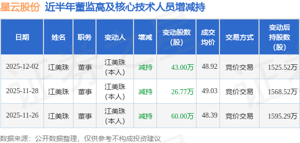 证券之星消息,根据12月3日市场公开信息、上市公司公告及交易所披露数据整理,星云股份(300648)最新董监高及相关人员股份变动情况:2025年12月2日公司董事江美珠共减持公司股份43.0万股,占公司总股本为0.2467%。变动期间公司股价下跌1.44%,12月2日当日收盘报48.73元。