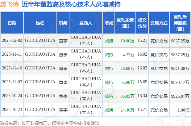 证券之星消息,根据12月3日市场公开信息、上市公司公告及交易所披露数据整理,英飞特(300582)最新董监高及相关人员股份变动情况:2025年12月2日公司董事GUICHAO HUA共减持公司股份10.0万股,占公司总股本为0.0335%。变动期间公司股价上涨0.86%,12月2日当日收盘报15.28元。