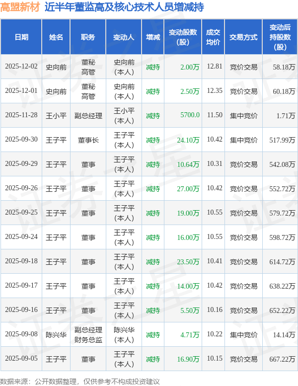 高盟新材近半年内的董监高及核心技术人员增减持详情如下: