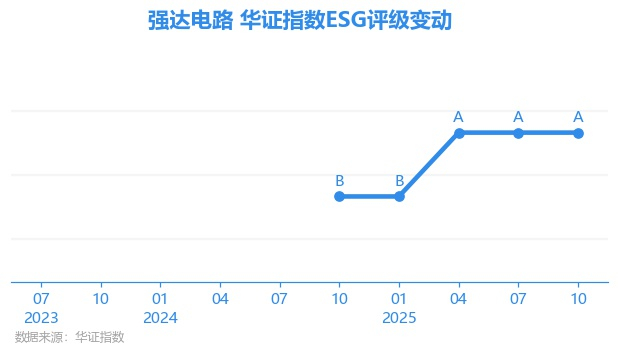 日前,华证指数公布了新一期(2025年10月31日)的ESG评级结果,强达电路(301628.SZ)获得A评级(华证指数评级为C起至AAA九档,C为最低档,AAA为其最高一级评级/AA为其第二档),上一期(2025年7月31日)ESG评级为A。本期ESG评级在531家电子设备、仪器和元件行业A股上市公司中排名第50(上一期排名第51)。