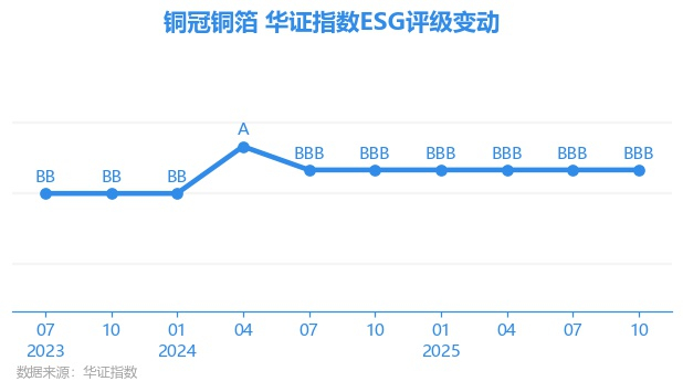 日前,华证指数公布了新一期(2025年10月31日)的ESG评级结果,铜冠铜箔(301217.SZ)获得BBB评级(华证指数评级为C起至AAA九档,C为最低档,AAA为其最高一级评级/AA为其第二档),上一期(2025年7月31日)ESG评级为BBB。本期ESG评级在531家电子设备、仪器和元件行业A股上市公司中排名第122(上一期排名第114)。