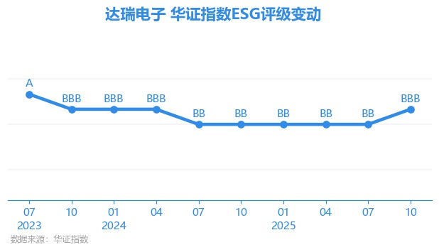 日前,华证指数公布了新一期(2025年10月31日)的ESG评级结果,达瑞电子(300976.SZ)获得BBB评级(华证指数评级为C起至AAA九档,C为最低档,AAA为其最高一级评级/AA为其第二档),上一期(2025年7月31日)ESG评级为BB。本期ESG评级在531家电子设备、仪器和元件行业A股上市公司中排名第150(上一期排名第159)。