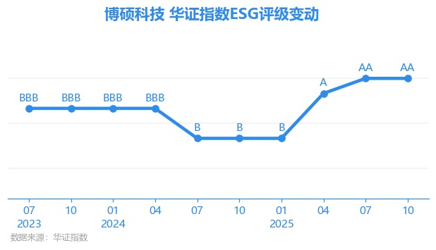 日前,华证指数公布了新一期(2025年10月31日)的ESG评级结果,博硕科技(300951.SZ)获得AA评级(华证指数评级为C起至AAA九档,C为最低档,AAA为其最高一级评级/AA为其第二档),上一期(2025年7月31日)ESG评级为AA。本期ESG评级在531家电子设备、仪器和元件行业A股上市公司中排名第32(上一期排名第35)。