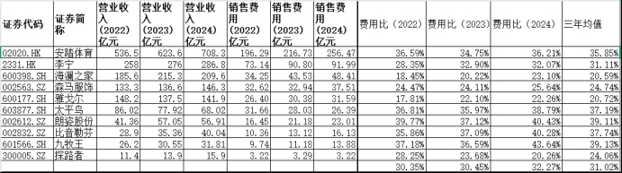 与此同时,部分企业呈现出不同的费用管控路径。海澜之家2022-2024年的销售费用分别为34.25亿元、43.53亿元、48.41亿元,销售费用率分别为18.45%、20.22%和23.1%,低于同期行业30.35%、30.45%、32.27%的平均水平。这种差异并非孤例,雅戈尔也长期保持着较低的销售费用率。