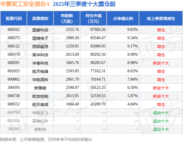 根据2025基金Q3季报公募基金重仓股数据,重仓该股的公募基金共19家,其中持有数量最多的公募基金为华夏基金的华夏军工安全混合A。华夏军工安全混合A目前规模为33.97亿元,最新净值1.728(12月3日),较上一交易日下跌0.12%,近一年上涨22.64%。该公募基金现任基金经理为万方方。