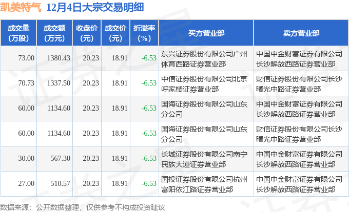 证券之星消息,12月4日凯美特气发生大宗交易,交易数据如下: