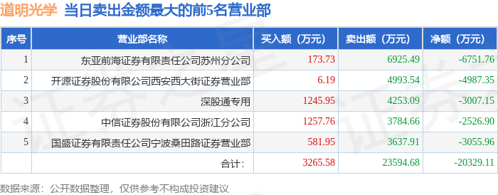 证券之星消息,沪深交易所2025年12月4日公布的交易公开信息显示,道明光学(002632)因日跌幅偏离值达到7%的前5只证券登上龙虎榜。此次是近5个交易日内第4次上榜。