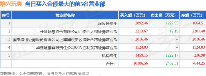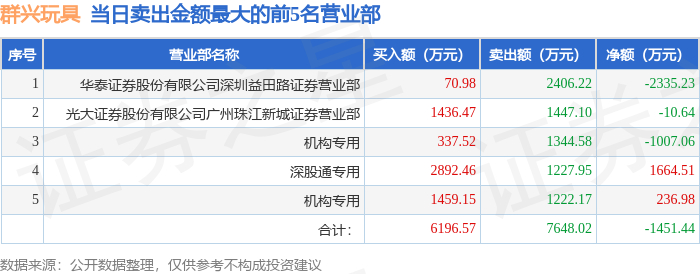 证券之星消息,沪深交易所2025年12月4日公布的交易公开信息显示,群兴玩具(002575)因日涨幅偏离值达到7%的前5只证券登上龙虎榜。此次是近5个交易日内第1次上榜。