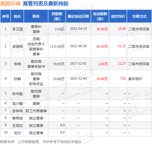 高能环境近半年内的董监高及核心技术人员增减持详情如下: