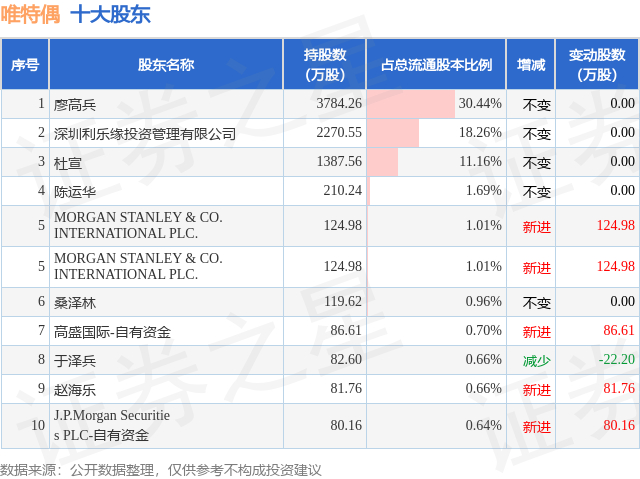 根据唯特偶2025年三季报公布的十大股东详情如下: