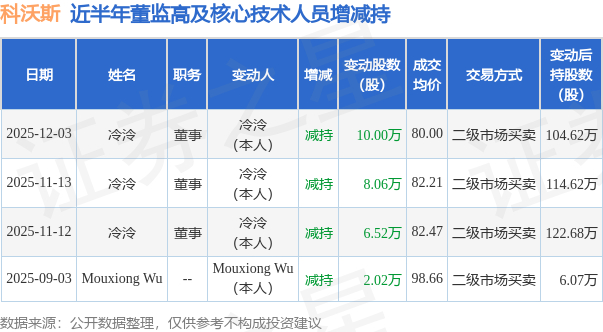 证券之星消息,根据12月4日市场公开信息、上市公司公告及交易所披露数据整理,科沃斯(603486)最新董监高及相关人员股份变动情况:2025年12月3日公司董事冷泠共减持公司股份10.0万股,占公司总股本为0.0173%。变动期间公司股价上涨4.59%,12月3日当日收盘报81.51元。