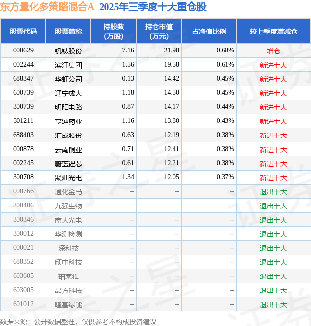 根据2025基金Q3季报公募基金重仓股数据,重仓该股的公募基金共1家,其中持有数量最多的公募基金为东方基金的东方量化多策略混合A。东方量化多策略混合A目前规模为0.29亿元,最新净值0.9323(12月4日),较上一交易日下跌0.1%,近一年上涨21.71%。该公募基金现任基金经理为盛泽 王怀勋。盛泽在任的基金产品包括:东方岳灵活配置混合,管理时间为2018年9月12日至今,期间收益率为126.12%;东方核心动力混合A,管理时间为2019年9月17日至今,期间收益率为73.84%;东方沪深300指数增强A,管理时间为2022年11月8日至今,期间收益率为21.02%。王怀勋在任的基金产品包括:东方量化成长灵活配置混合A,管理时间为2022年5月17日至今,期间收益率为55.97%;东方沪深300指数增强A,管理时间为2025年9月16日至今,期间收益率为0.26%;东方中证A500指数增强A,管理时间为2025年9月16日至今,期间收益率为0.29%。