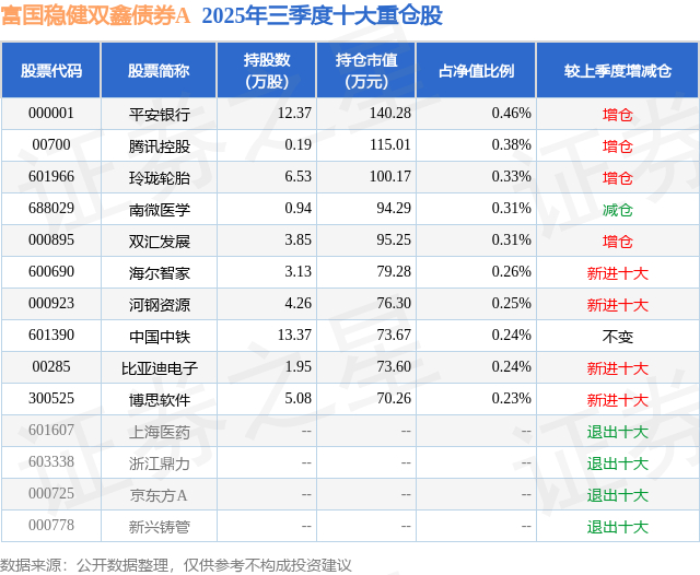 根据2025基金Q3季报公募基金重仓股数据,重仓该股的公募基金共1家,其中持有数量最多的公募基金为富国基金的富国稳健双鑫债券A。富国稳健双鑫债券A目前规模为2.24亿元,最新净值1.0639(12月4日),较上一交易日下跌0.07%,近一年上涨4.09%。该公募基金现任基金经理为朱晨杰。朱晨杰在任的基金产品包括:富国腾享回报6个月滚动持有A,管理时间为2023年6月28日至今,期间收益率为13.03%;富国双利增强债券A,管理时间为2023年9月8日至今,期间收益率为12.11%;富国可转债A,管理时间为2024年12月20日至今,期间收益率为15.52%。