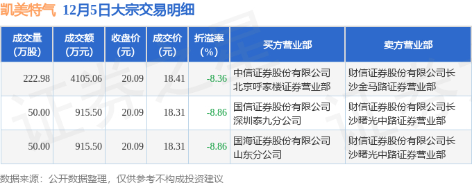 证券之星消息,12月5日凯美特气发生大宗交易,交易数据如下: