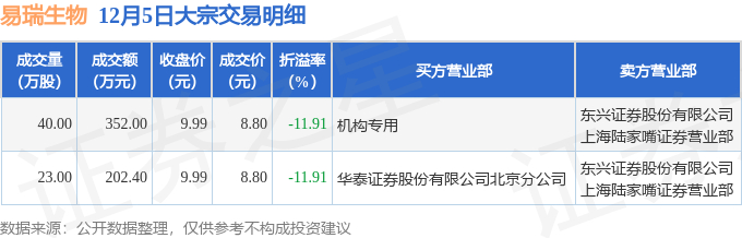 证券之星消息,12月5日易瑞生物发生大宗交易,交易数据如下: