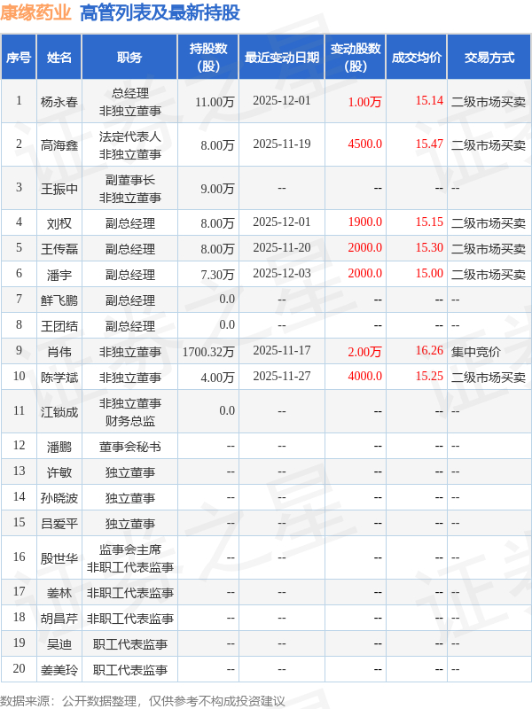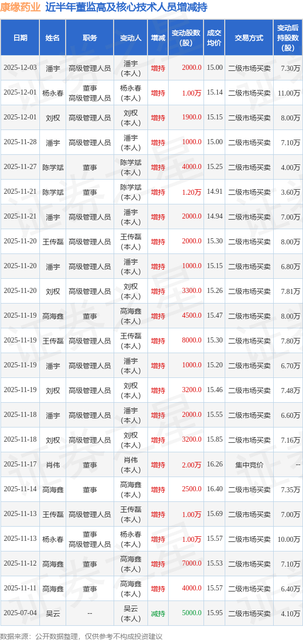 证券之星消息,根据12月5日市场公开信息、上市公司公告及交易所披露数据整理,康缘药业(600557)最新董监高及相关人员股份变动情况:2025年12月3日公司高级管理人员潘宇共增持公司股份2000.0股,占公司总股本为0.0004%。变动期间公司股价上涨0.2%,12月3日当日收盘报15.13元。