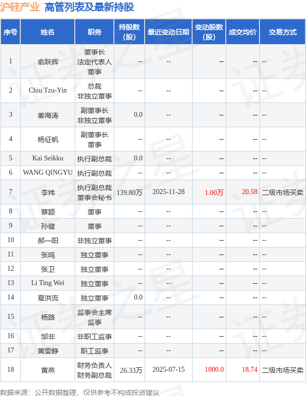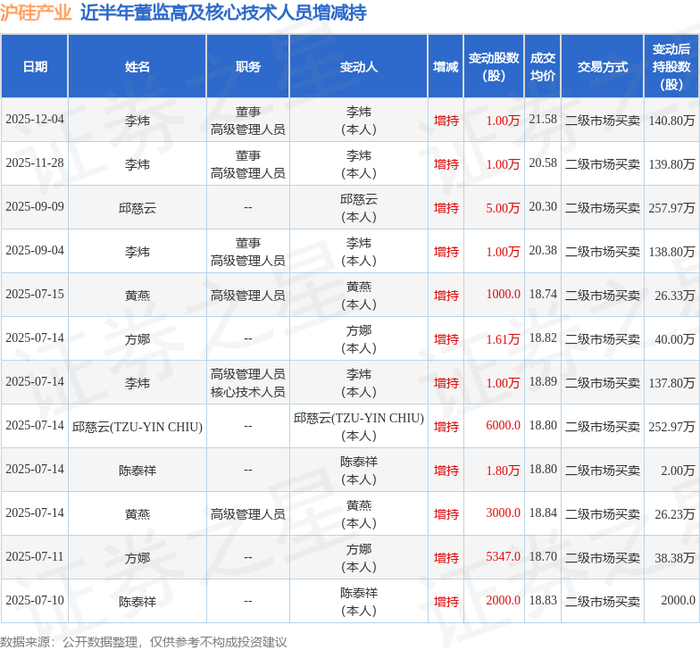 沪硅产业近半年内的董监高及核心技术人员增减持详情如下: