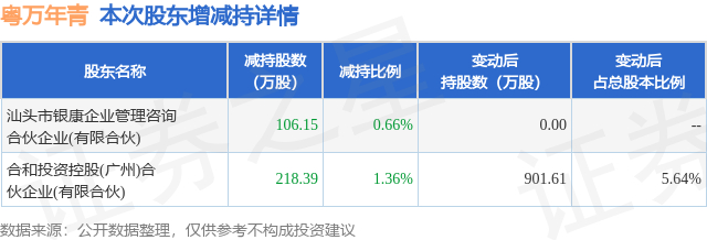 证券之星消息,12月5日粤万年青发布公告《粤万年青:关于控股股东、实际控制人之一致行动人减持股份变动触及1%暨减持计划实施完毕的公告》,其股东汕头市银康企业管理咨询合伙企业(有限合伙)、合和投资控股(广州)合伙企业(有限合伙)于2025年12月3日至2025年12月4日间合计减持324.54万股,占公司目前总股本的2.0284%,变动期间该股股价上涨14.99%,截止12月4日收盘报27.92元。
