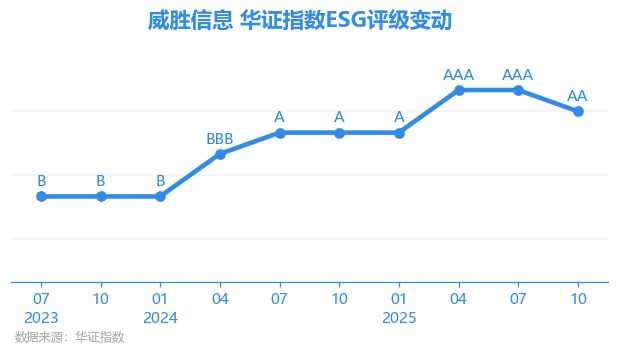 日前,华证指数公布了新一期(2025年10月31日)的ESG评级结果,威胜信息(688100.SH)获得AA评级(华证指数评级为C起至AAA九档,C为最低档,AAA为其最高一级评级/AA为其第二档),上一期(2025年7月31日)ESG评级为AAA。本期ESG评级在165家软件行业A股上市公司中排名第1(上一期排名第1)。