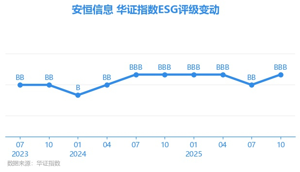 日前,华证指数公布了新一期(2025年10月31日)的ESG评级结果,安恒信息(688023.SH)获得BBB评级(华证指数评级为C起至AAA九档,C为最低档,AAA为其最高一级评级/AA为其第二档),上一期(2025年7月31日)ESG评级为BB。本期ESG评级在155家信息技术服务行业A股上市公司中排名第25(上一期排名第25)。