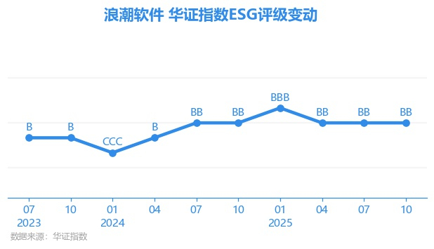 日前,华证指数公布了新一期(2025年10月31日)的ESG评级结果,浪潮软件(600756.SH)获得BB评级(华证指数评级为C起至AAA九档,C为最低档,AAA为其最高一级评级/AA为其第二档),上一期(2025年7月31日)ESG评级为BB。本期ESG评级在165家软件行业A股上市公司中排名第75(上一期排名第45)。