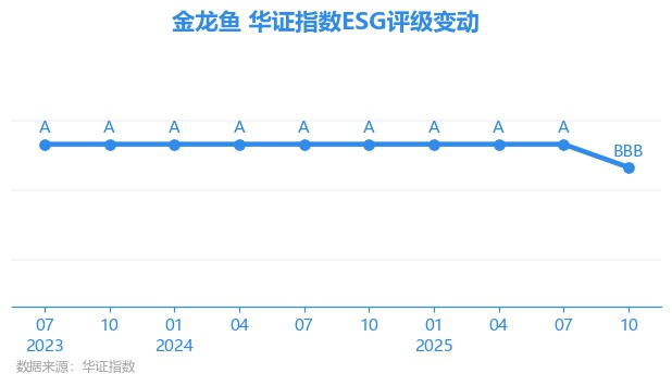日前,华证指数公布了新一期(2025年10月31日)的ESG评级结果,金龙鱼(300999.SZ)获得BBB评级(华证指数评级为C起至AAA九档,C为最低档,AAA为其最高一级评级/AA为其第二档),上一期(2025年7月31日)ESG评级为A。本期ESG评级在168家食品行业A股上市公司中排名第13(上一期排名第11)。