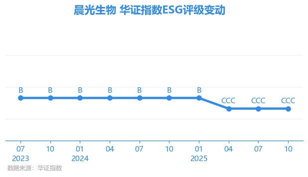 日前,华证指数公布了新一期(2025年10月31日)的ESG评级结果,晨光生物(300138.SZ)获得CCC评级(华证指数评级为C起至AAA九档,C为最低档,AAA为其最高一级评级/AA为其第二档),上一期(2025年7月31日)ESG评级为CCC。本期ESG评级在168家食品行业A股上市公司中排名第79(上一期排名第59)。