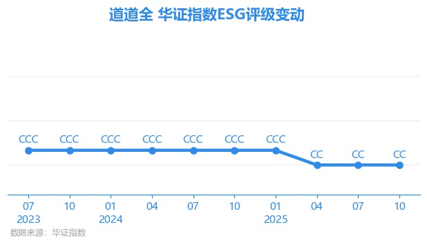 日前,华证指数公布了新一期(2025年10月31日)的ESG评级结果,道道全(002852.SZ)获得CC评级(华证指数评级为C起至AAA九档,C为最低档,AAA为其最高一级评级/AA为其第二档),上一期(2025年7月31日)ESG评级为CC。本期ESG评级在168家食品行业A股上市公司中排名第127(上一期排名第122)。