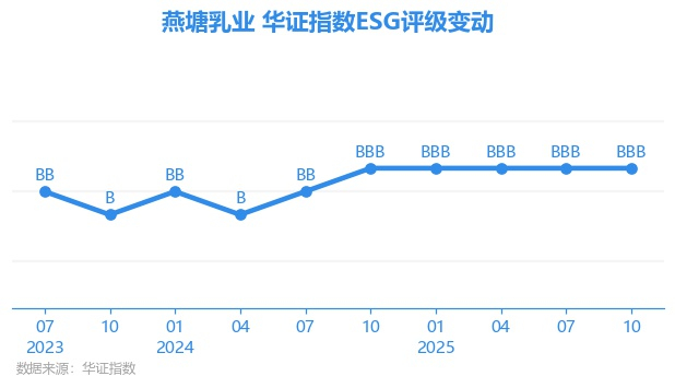 日前,华证指数公布了新一期(2025年10月31日)的ESG评级结果,燕塘乳业(002732.SZ)获得BBB评级(华证指数评级为C起至AAA九档,C为最低档,AAA为其最高一级评级/AA为其第二档),上一期(2025年7月31日)ESG评级为BBB。本期ESG评级在168家食品行业A股上市公司中排名第25(上一期排名第20)。