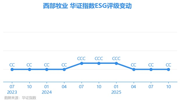 日前,华证指数公布了新一期(2025年10月31日)的ESG评级结果,西部牧业(300106.SZ)获得CC评级(华证指数评级为C起至AAA九档,C为最低档,AAA为其最高一级评级/AA为其第二档),上一期(2025年7月31日)ESG评级为CC。本期ESG评级在168家食品行业A股上市公司中排名第130(上一期排名第110)。