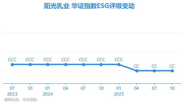 日前,华证指数公布了新一期(2025年10月31日)的ESG评级结果,阳光乳业(001318.SZ)获得CC评级(华证指数评级为C起至AAA九档,C为最低档,AAA为其最高一级评级/AA为其第二档),上一期(2025年7月31日)ESG评级为CC。本期ESG评级在168家食品行业A股上市公司中排名第124(上一期排名第115)。
