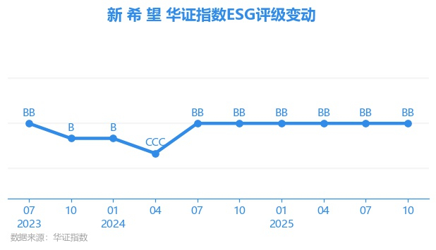 日前,华证指数公布了新一期(2025年10月31日)的ESG评级结果,新 希 望(000876.SZ)获得BB评级(华证指数评级为C起至AAA九档,C为最低档,AAA为其最高一级评级/AA为其第二档),上一期(2025年7月31日)ESG评级为BB。本期ESG评级在168家食品行业A股上市公司中排名第37(上一期排名第39)。