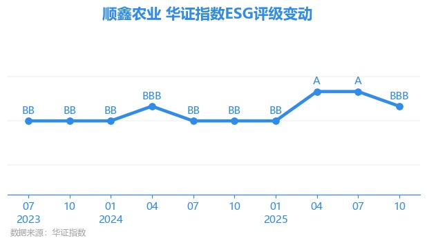 日前,华证指数公布了新一期(2025年10月31日)的ESG评级结果,顺鑫农业(000860.SZ)获得BBB评级(华证指数评级为C起至AAA九档,C为最低档,AAA为其最高一级评级/AA为其第二档),上一期(2025年7月31日)ESG评级为A。本期ESG评级在51家饮料行业A股上市公司中排名第17(上一期排名第14)。