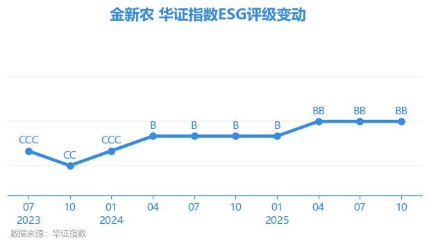 日前,华证指数公布了新一期(2025年10月31日)的ESG评级结果,金新农(002548.SZ)获得BB评级(华证指数评级为C起至AAA九档,C为最低档,AAA为其最高一级评级/AA为其第二档),上一期(2025年7月31日)ESG评级为BB。本期ESG评级在168家食品行业A股上市公司中排名第29(上一期排名第33)。